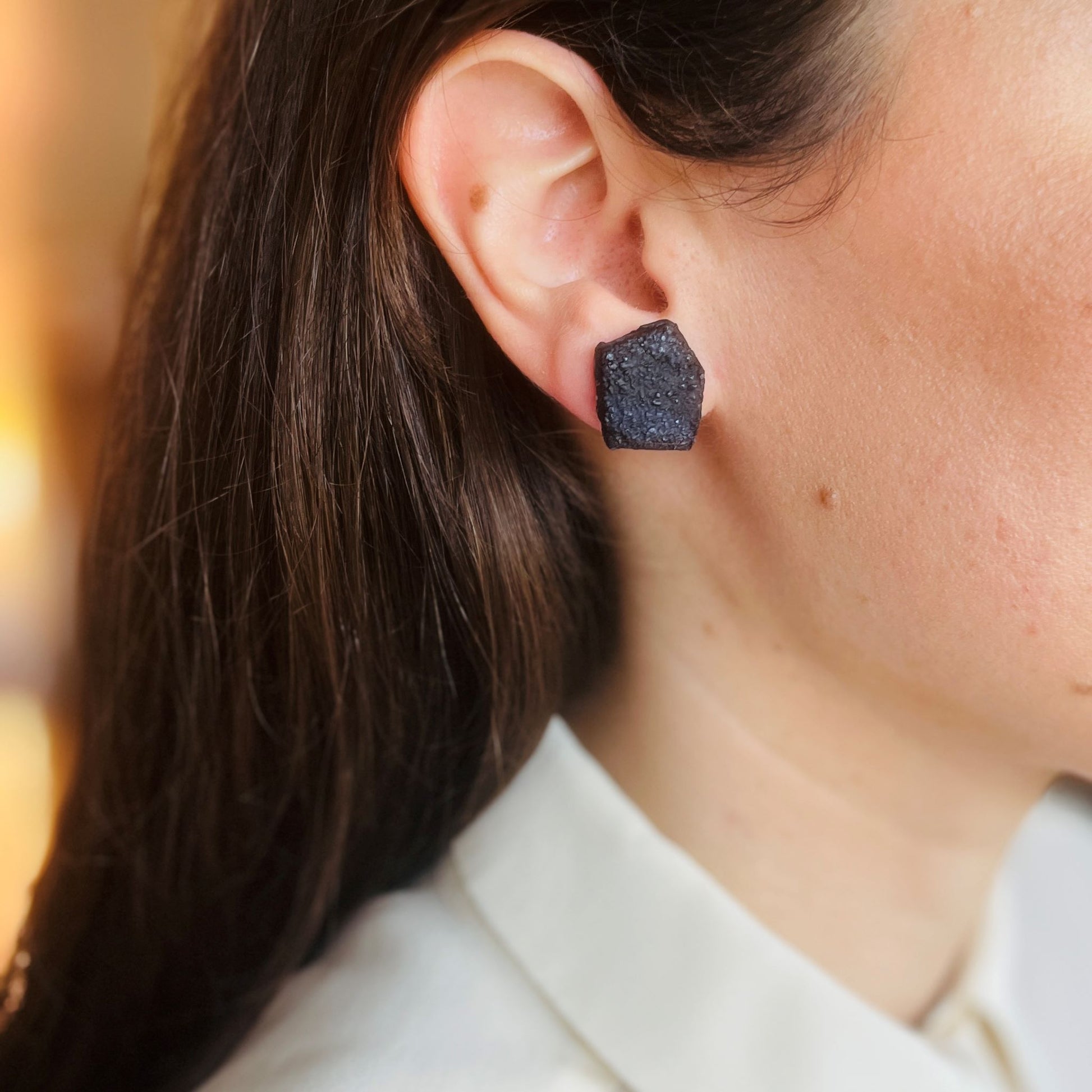 The Salis Black earrings combine modern aesthetics with a raw, organic finish. Their deep black, textured surface evokes the elegance of natural stones, making them versatile yet bold statement pieces. The use of salt in their creation enhances their unique crystallized appearance, ensuring each pair is one of a kind.